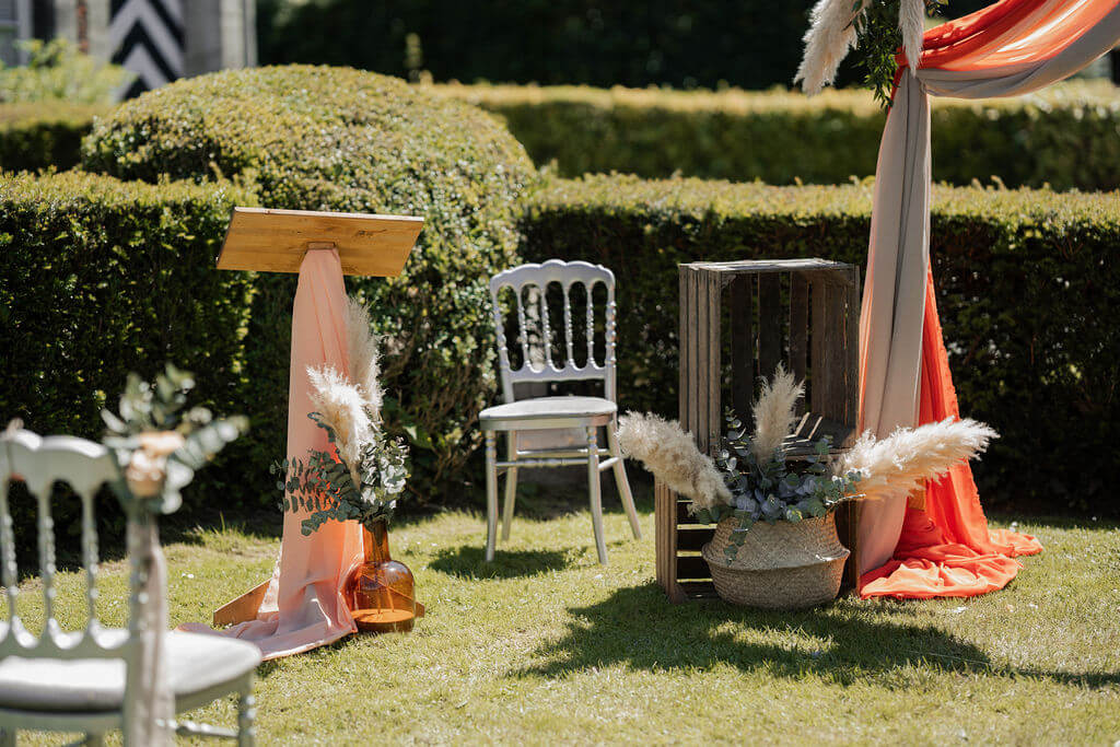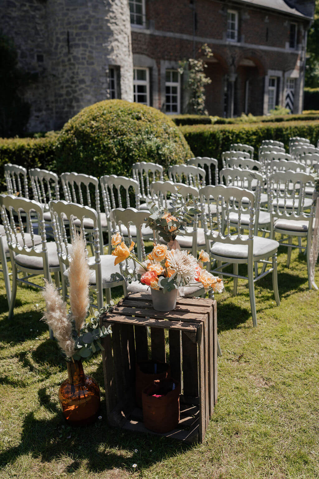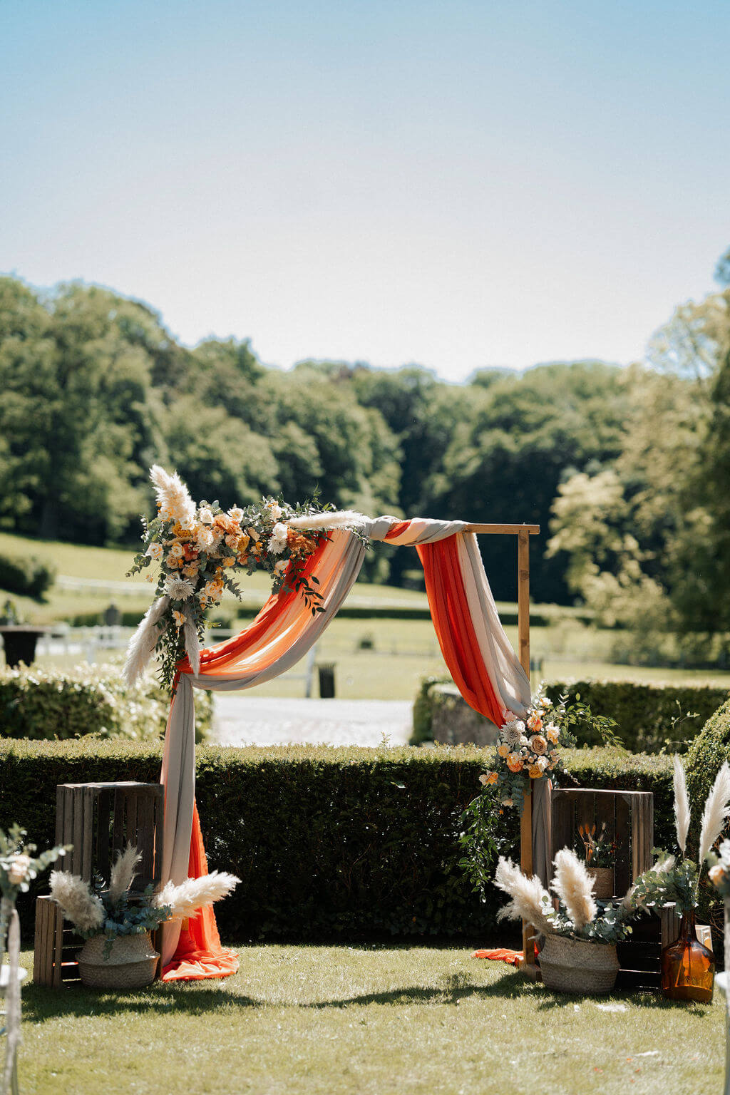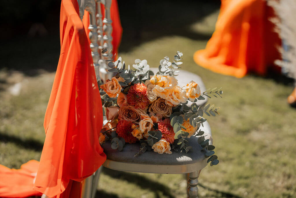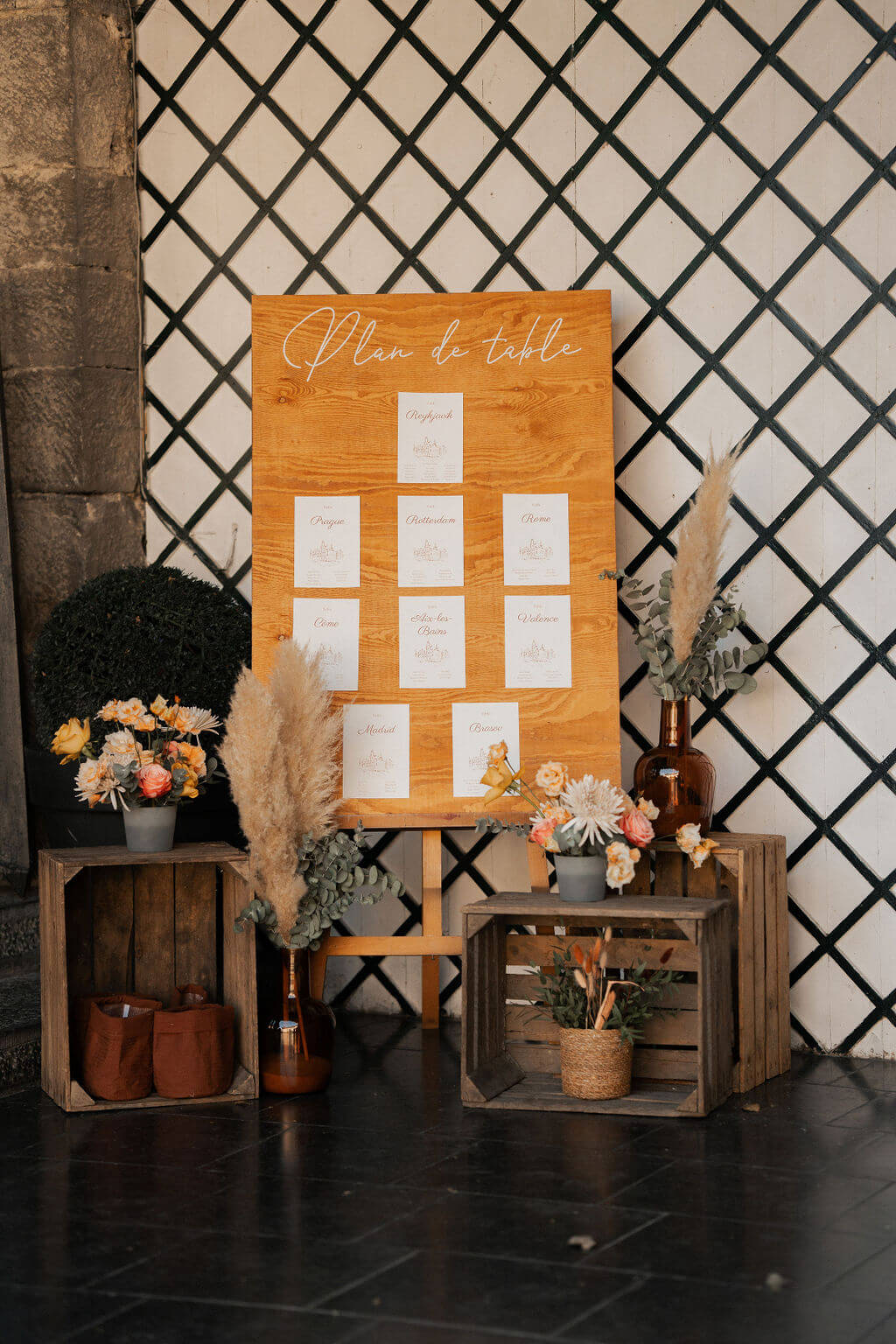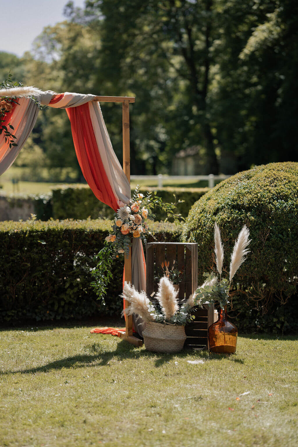 Pour leur décoration, nous avons imaginé un mélange de fleurs fraîches et de fleurs séchées. Un duo qui apporte relief, texture et profondeur, en parfaite harmonie avec une palette aux tons orange, pêche et beige.