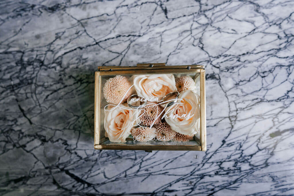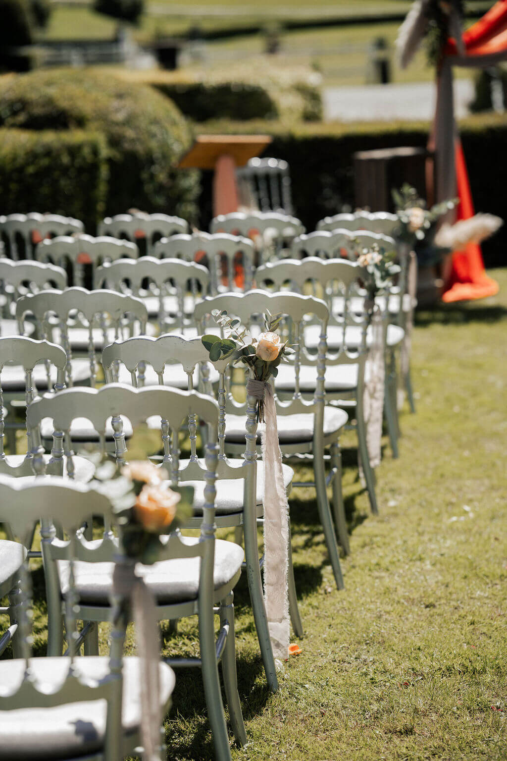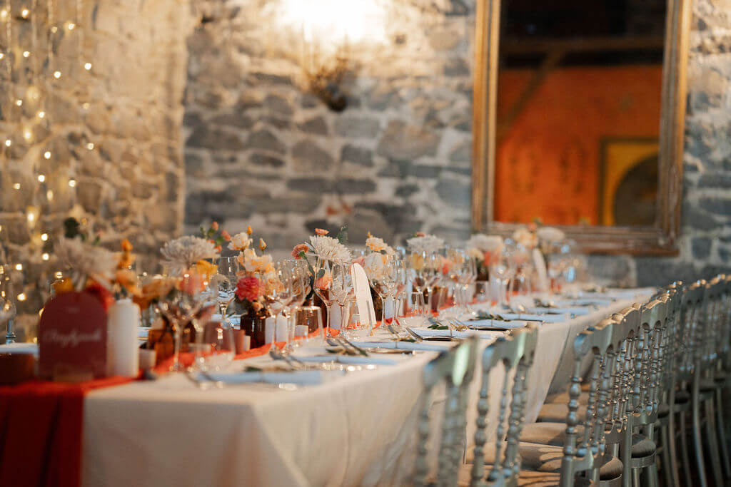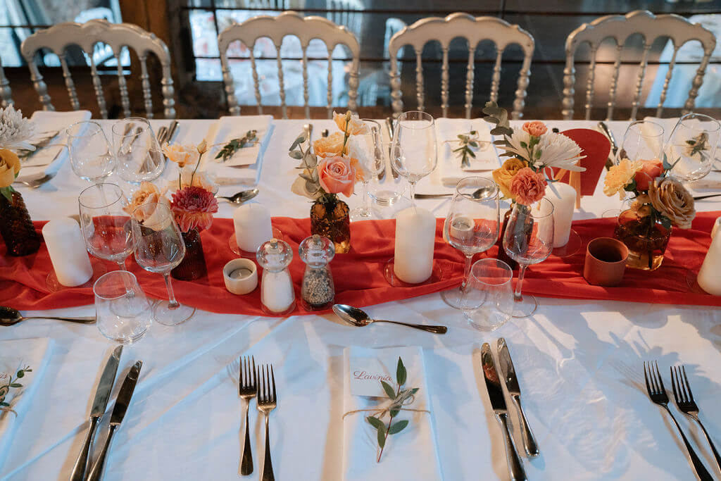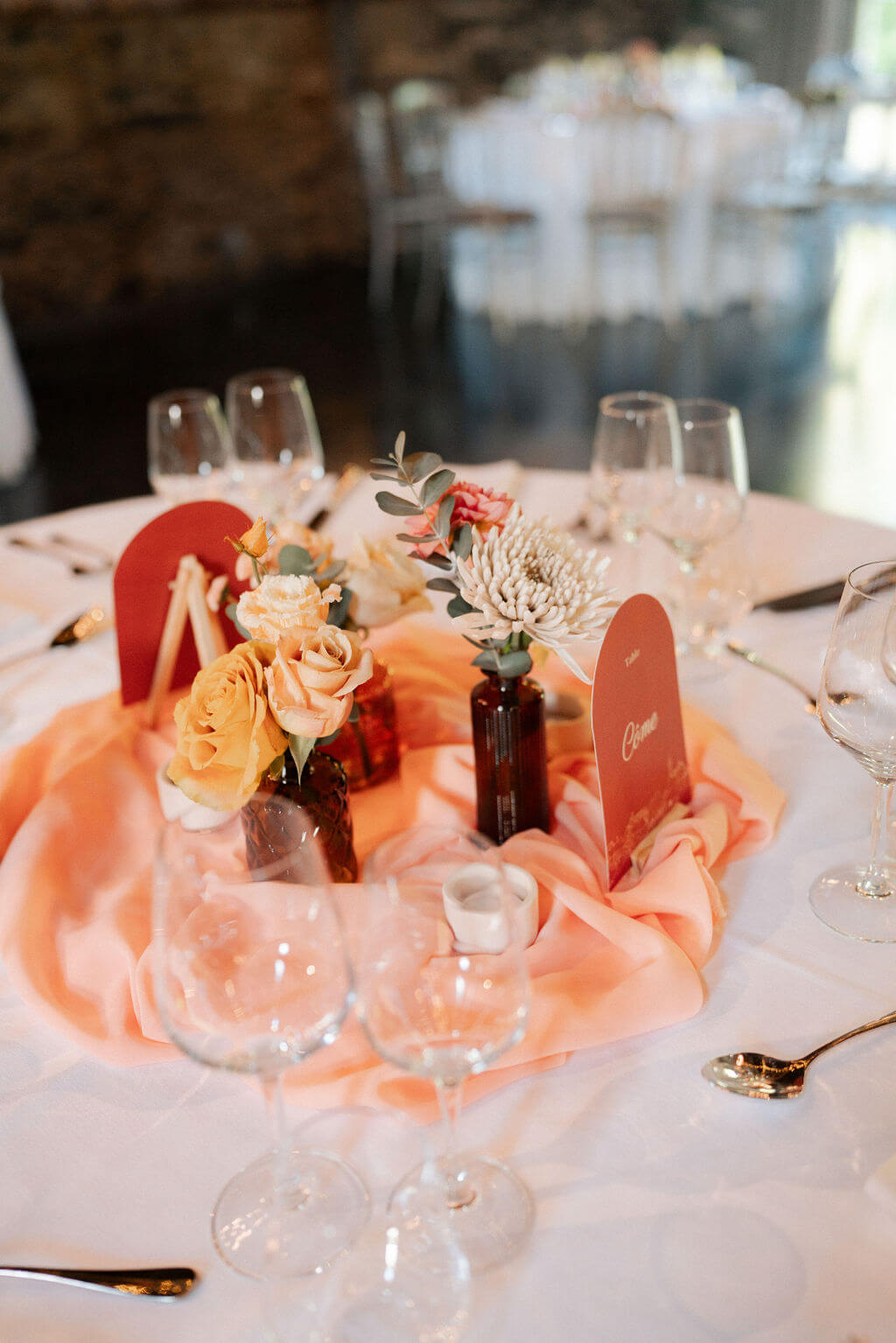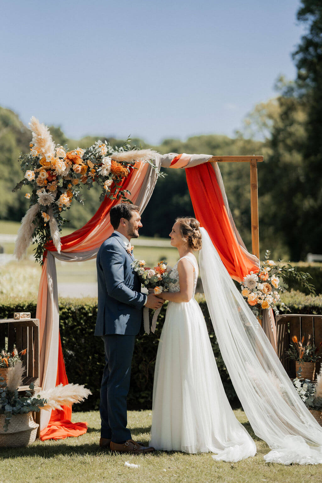 Pour leur décoration, nous avons imaginé un mélange de fleurs fraîches et de fleurs séchées. Un duo qui apporte relief, texture et profondeur, en parfaite harmonie avec une palette aux tons orange, pêche et beige.